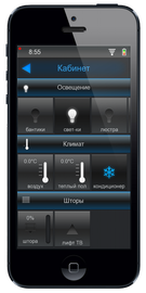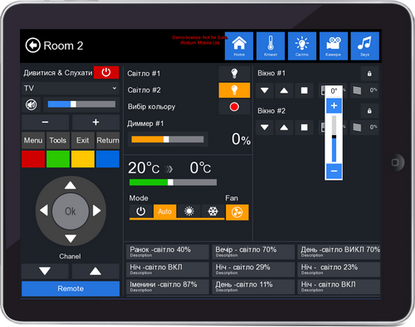 Використовуючи програмний комплекс Iridium mobile ми створимо оригінальний дизайн інтерфейсу керування Вашим «розумним будинком». Легким дотиком до екрану панелі господар вибирає прилад, роботу якого потрібно відрегулювати, і задає необхідні параметри.